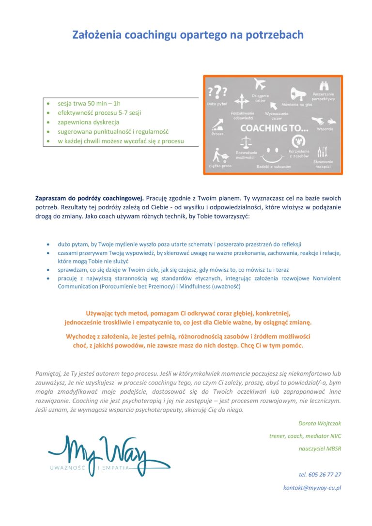 Coaching oparty na potrzebach i uważności bazuje na Porozumieniu bez Przemocy Marshalla Rosenberga i mindfulness Jona Kabat Zinna. Za zachowaniami, z których jesteś zadowolony bądź nie – szukamy potrzeb i wartości. I sprawdzamy, na ile są spójne z Twoimi wyborami.
